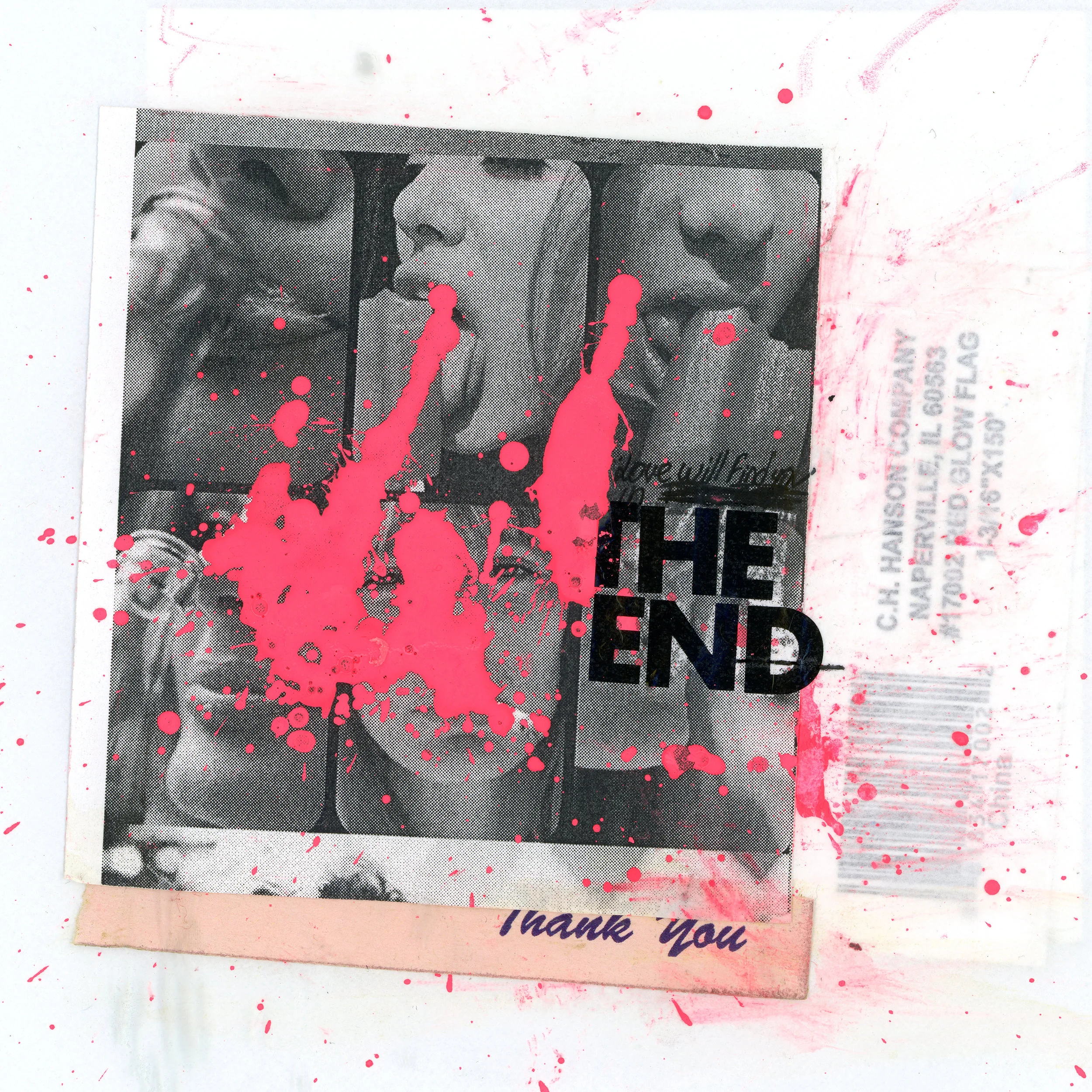 Found Objects Over Wood Panel. Magenta construction tape over Lettraset transfer letters over photocopied paper over Epipen package over 1930's postcard and LEVI's size tag wheat pasted over wood panel.