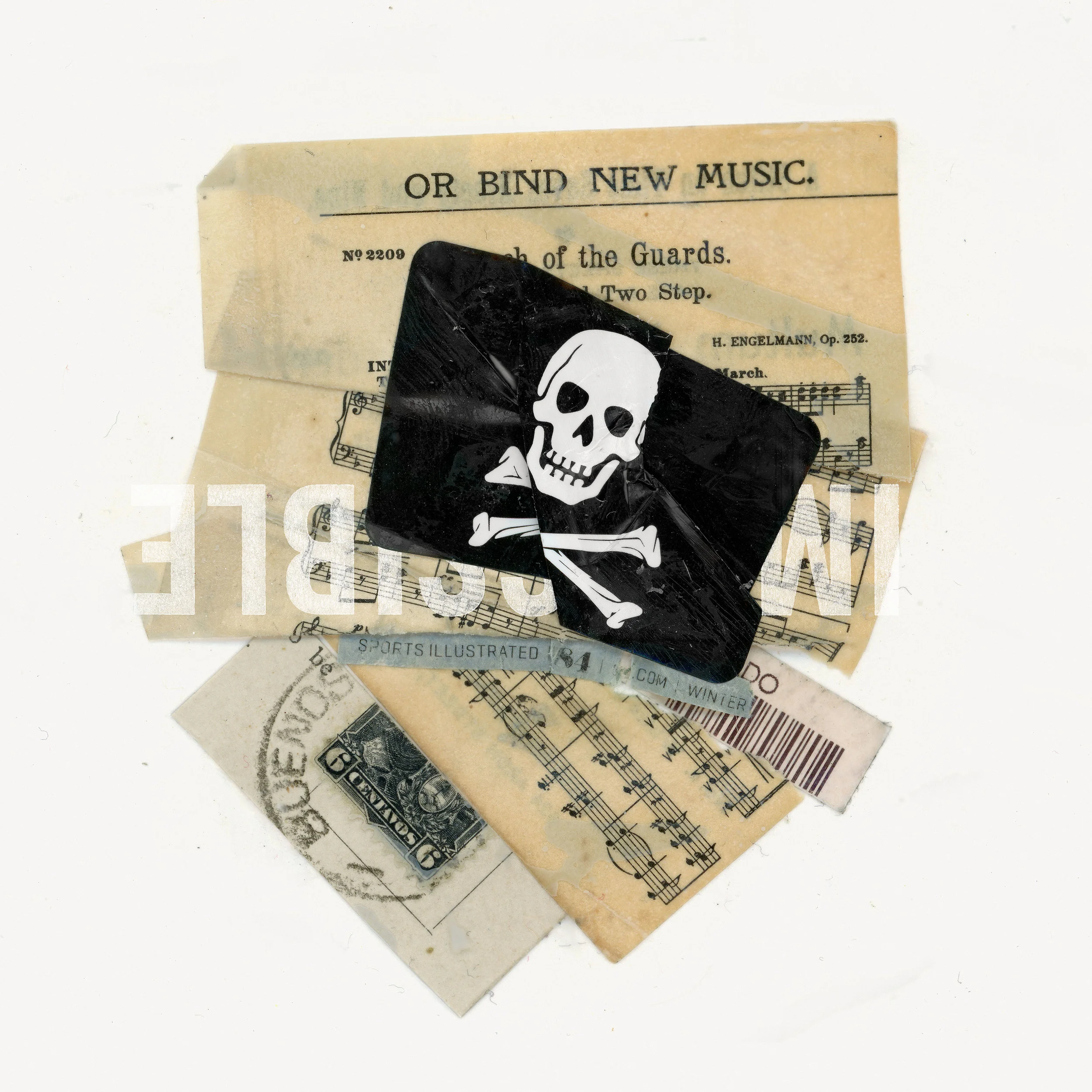 Found Objects Over Wood Panel. skull sticker over 1800's music book page, over acrylic paint over Argentinian postcard cutout with 6cent stamp, over sports Illustrated cutout wheat pasted over wood panel.